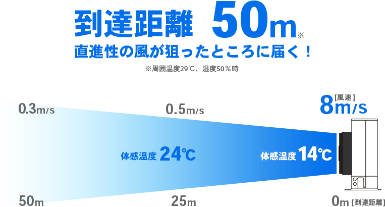 直進性がある風なので狙った所に大冷風が届きます(実測50m)。