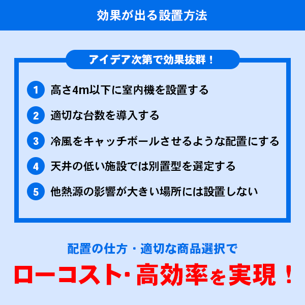 直進性のある風を作り、簡易的に設置することが出来るスポットバズーカは、設置の仕方次第で、より効率的に冷却効果を発揮することができます。
