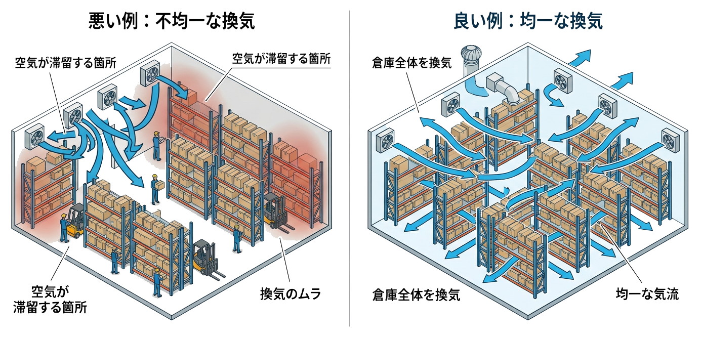 このため、倉庫の換気では自然換気だけでは不十分であり、機械換気を導入する場合でも、気流の設計を慎重に行う必要があります。給排気の位置関係、ファンの能力、誘引ファンの配置など、空間全体の空気の流れを考慮した計画が不可欠です。