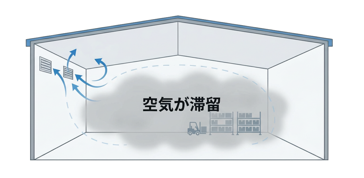 倉庫は間仕切りのない広い空間で、天井が高く、床面積が数百㎡、天井高6m以上というケースも珍しくありません。中心部から壁までの距離が長く、窓や換気扇を設置しても空気が全体に行き渡るまでに時間がかかります。