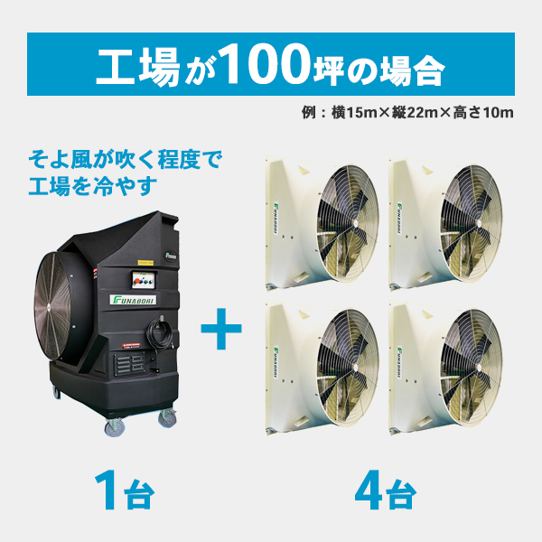 工場が100坪(横15m×縦22m)で高さが10mの場合、体積は約3,300㎥になります。そよ風が吹く程度で工場を冷やすには、1時間あたり空気を20回転させる必要があり、体積は3,300㎥×20回転=66,000㎥ へと変わります。当社大型換気扇【S301D排気用送風機】は1時間に20,000㎥の換気能力があり、66,000㎥÷20,000㎥=3.3台すなわち4台設置し、さらに水冷扇【M602-COOL】1台で冷風を送れば工場の中は快適な環境に変わります。